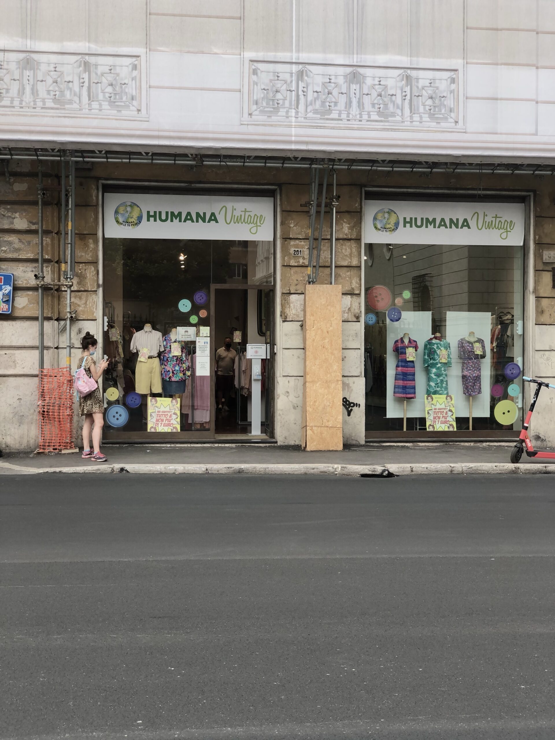 Humanu znám převážně ze Slovenska a nenapadlo mě, že na ni narazím v Římě. V celé metropoli se vyskytují pouze tři prodejny s dost zajímavými kousky, než známe z Textile House. Většinou v tuzemských sekáčích jsou věšáky plné Fast Fashion značek. Za to, i když v italské Humaně měli vše 7 eur, ve výběru se střídaly džíny pouze značek Dolce&Gabbana , Armani a Levi’s. Mezi obuví ležely baleríny Prada a v sakách se dá objevit Stefanel a MaxMara.